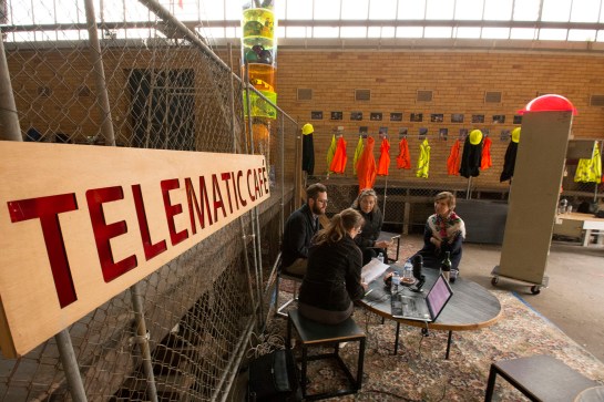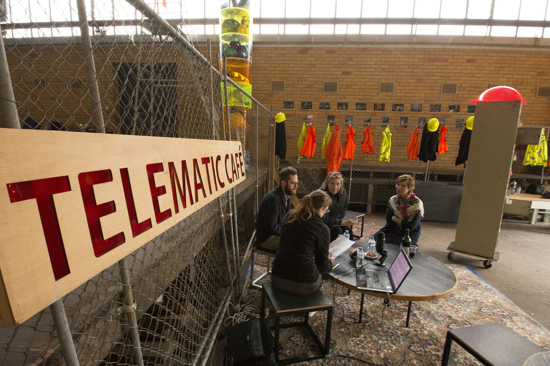 Telematic Cafe discussions during VACANTGeelong Open Studio day, 24 May 2017, North Geelong industrial precinct.